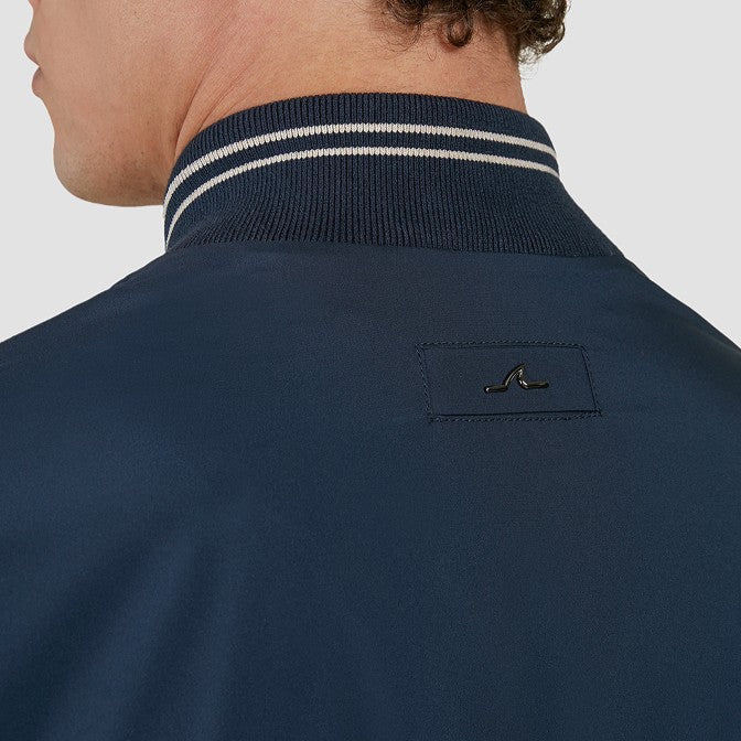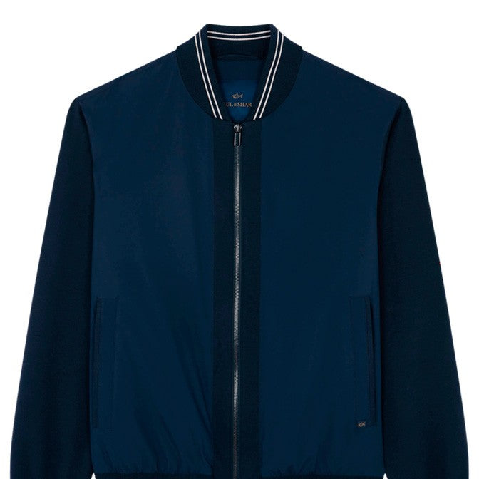 The blue zip-up jacket is made of functional fabric. It is complemented by knitted sleeves, a stand-up collar with a contrasting stripe, a two-way zip, as well as side pockets and an internal zip pocket. The jacket is suitable for casual or more sporty looks.