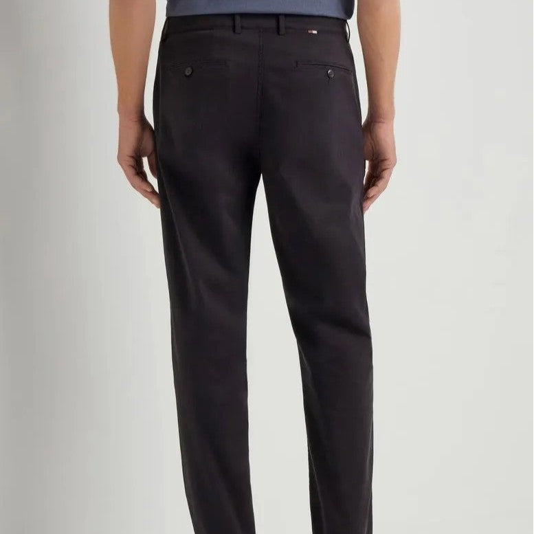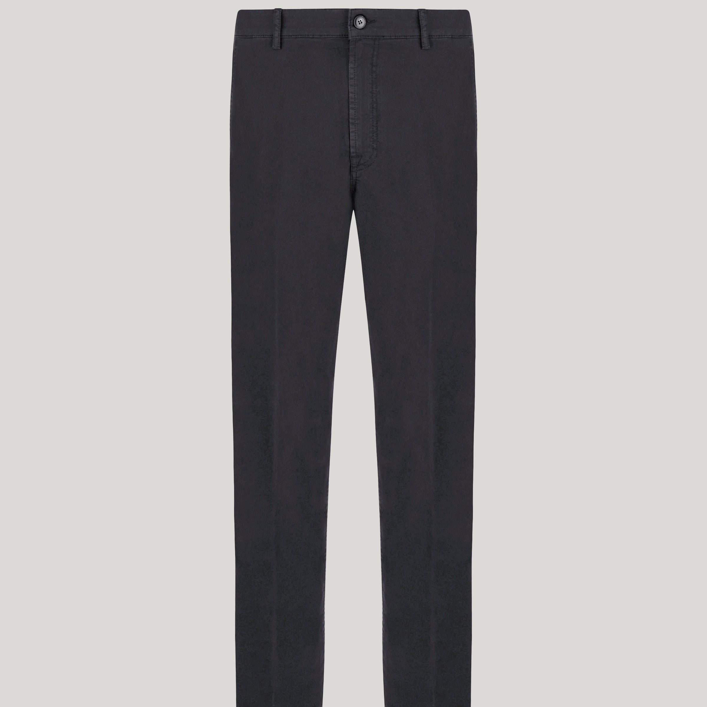 Chinos in garment-dyed cotton microtwill, featuring a design embodied by the button fastening and double welt pockets with button. A distinctive appeal, characterised by the unique carrot fit and sophisticated colour scheme, completes this garment designed to stylishly dress the modern businessman for any smart-casual occasion.