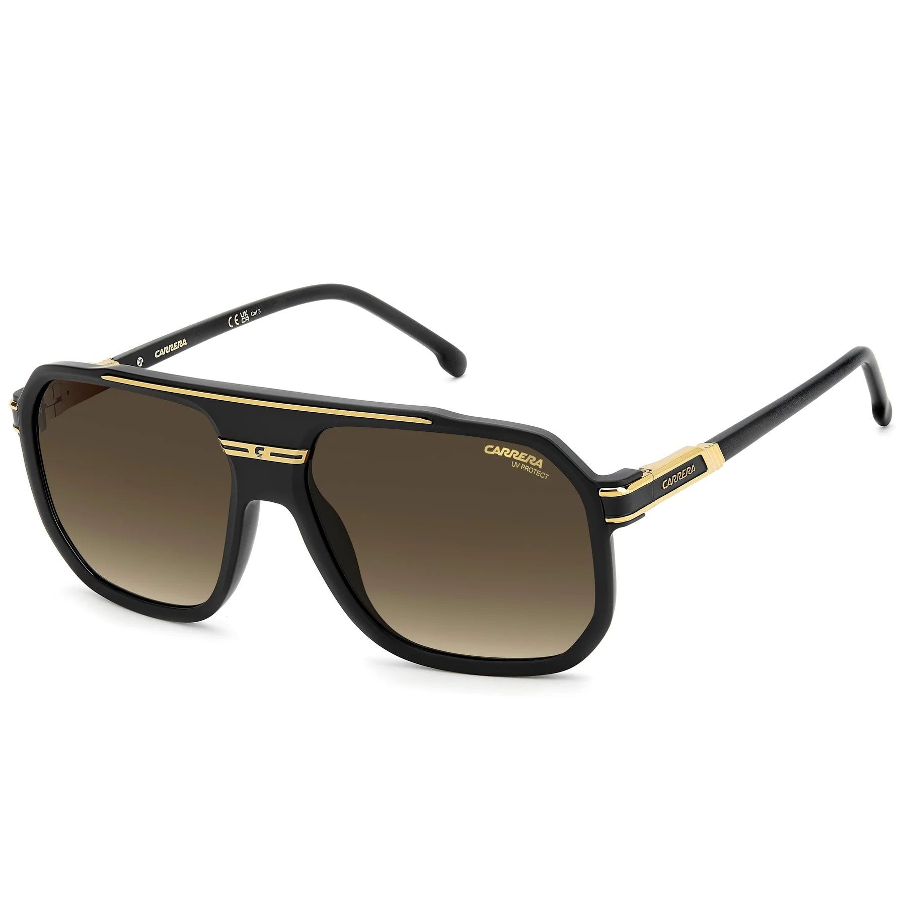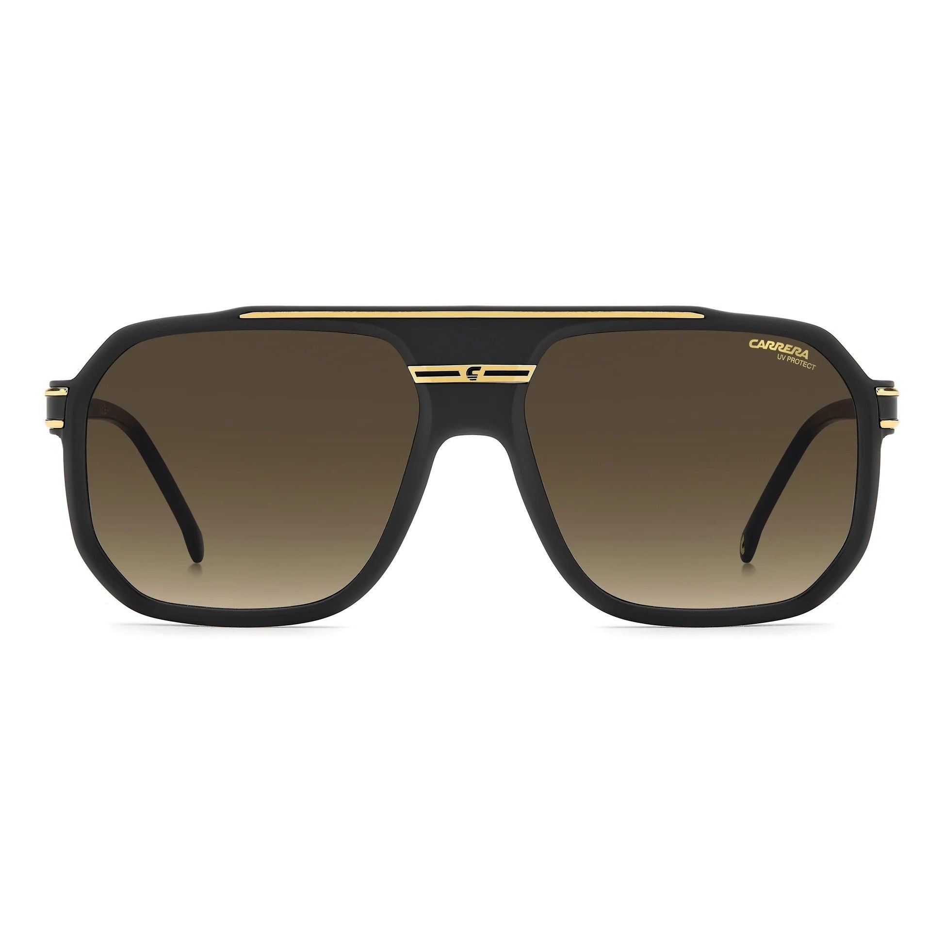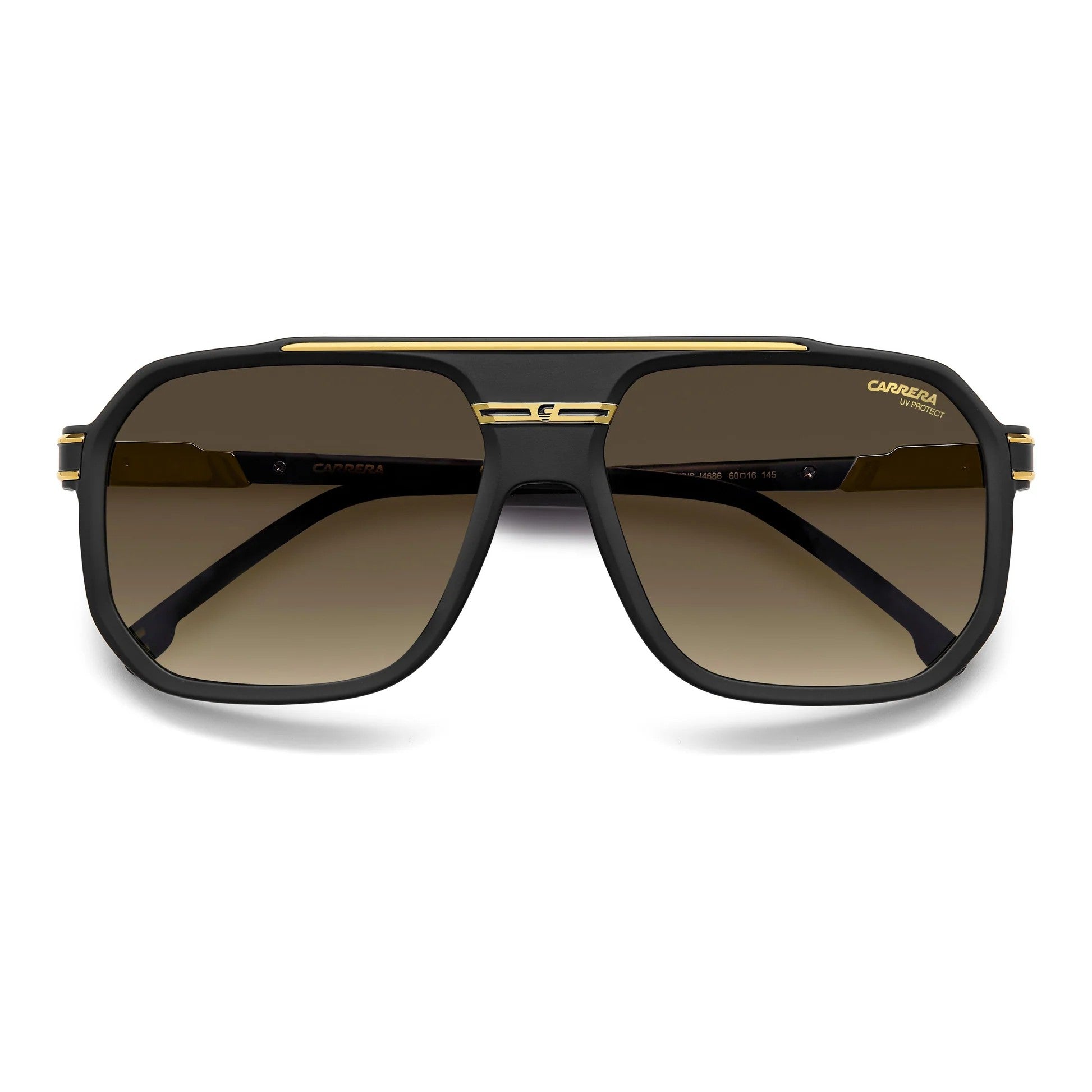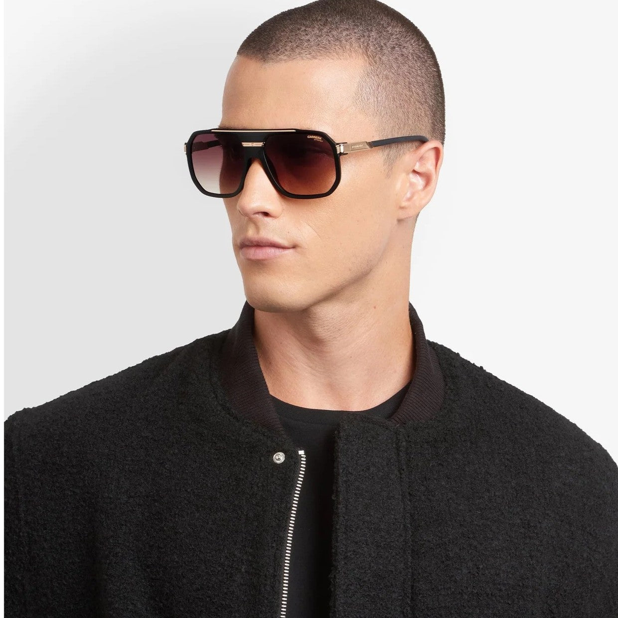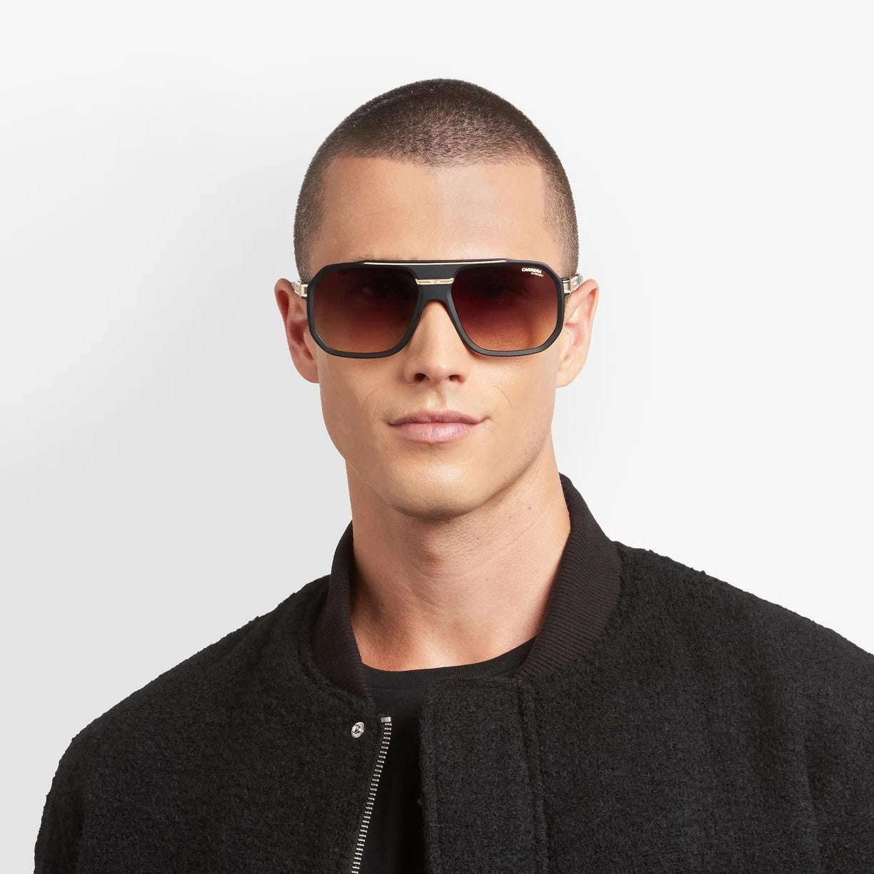 These sunglasses add style to any outfit. The navigator front has clean, bold lines with the Carrera C logo between the lenses. The temples combine metal and acetate, either transparent or solid to match the frames. Polarized and mirrored lenses are available.