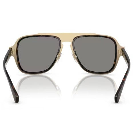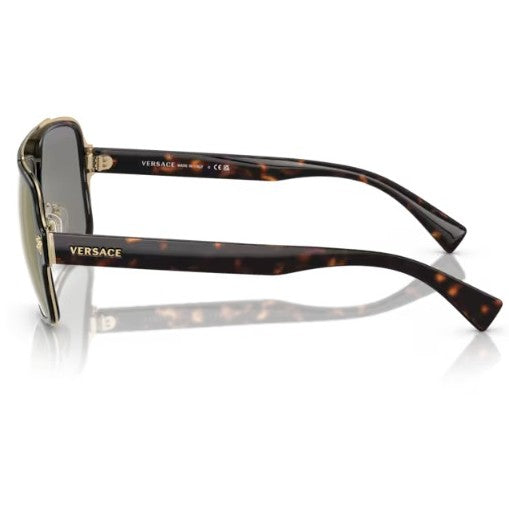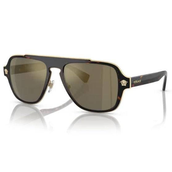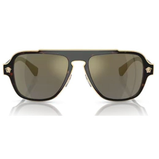 These Havana sunglasses with a double nose bridge feature a gold Medusa on each side and Versace written on the sides.