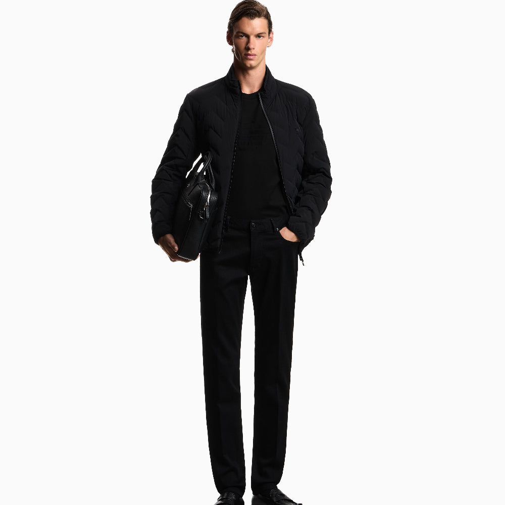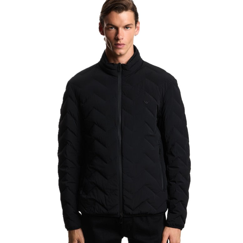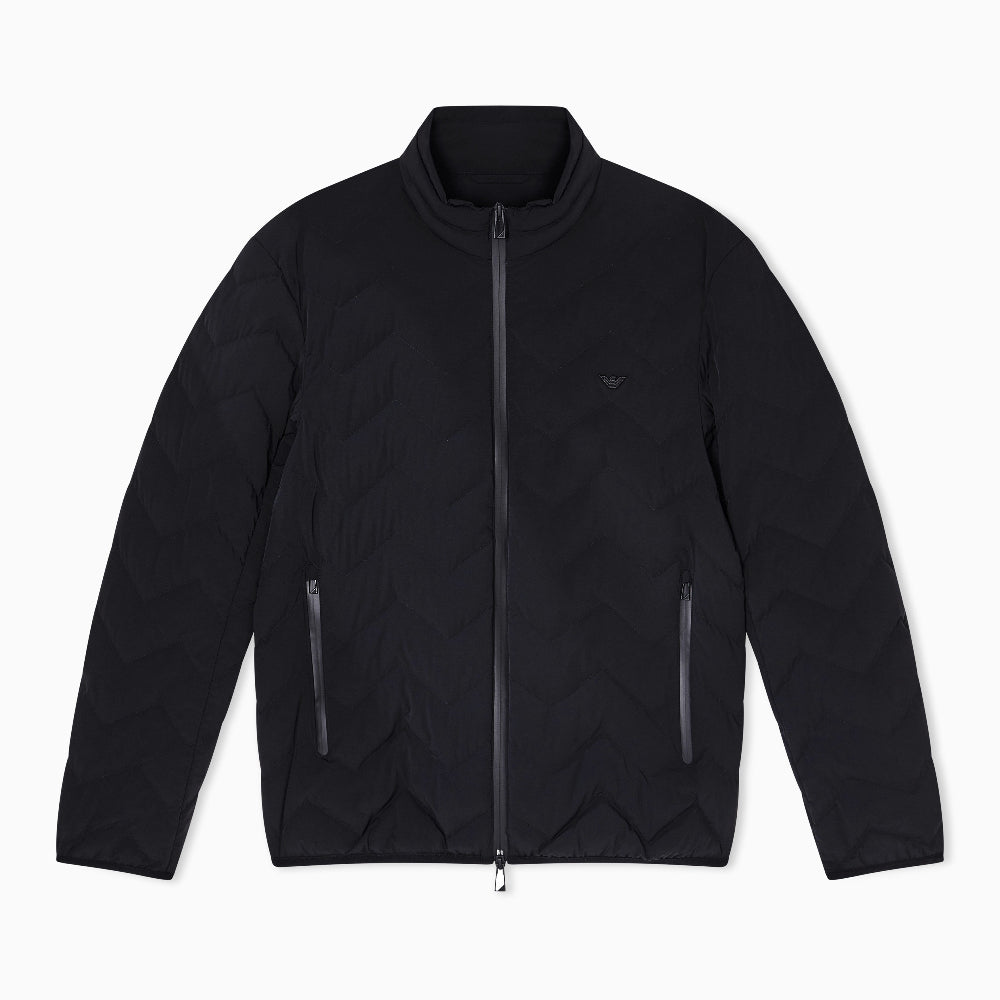Down jacket with full-zip fastening made from chevron quilted nylon spandex. The fabric used combines its extremely light weight with excellent strength and durability. These characteristics, together with its water-repellent properties, make it a suitable piece for multiple situations, ensuring comfort and performance in different weather conditions. The snug fit from the genuine down filling is enhanced by the quilting. This item belongs to the Essentials selection, the Emporio Armani offering that is an evergreen statement of style: an ongoing collection with clean, well-designed shapes for a wardrobe that meets the demands of any season. These “essential”, versatile pieces are a must-have for the male wardrobe.